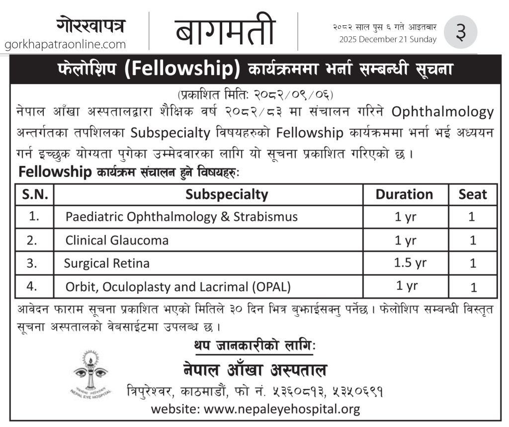 Welcome to Nepal Eye Hospital, where excellence in eye care meets advanced training in ophthalmic sub-specialties. As a leading eye hospital, we take pride in conducting fellowship programs that nurture the next generation of eye care specialists.
